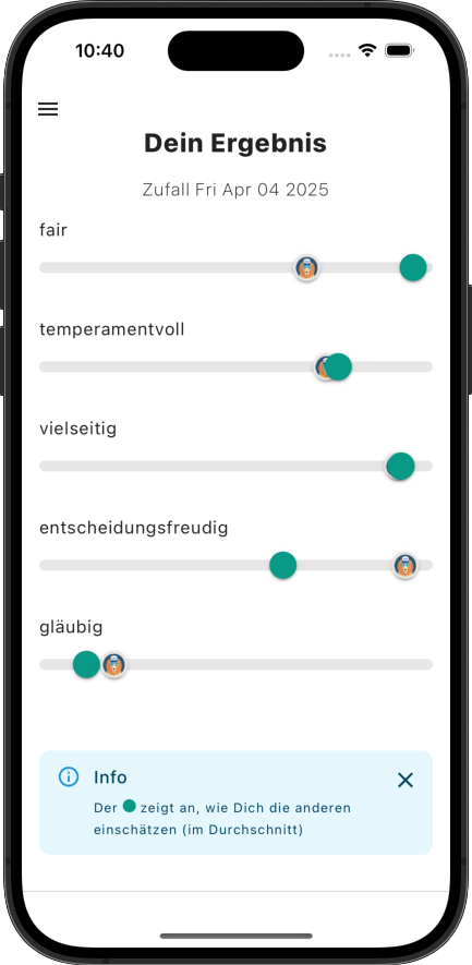 Teilnehmer schätzen sich selbst und gegenseitig auf ausgewählte Eigenschaften ein. Die App zeigt anschließend, wie Selbst- und Fremdeinschätzungen übereinstimmen – oder wo sie voneinander abweichen.
